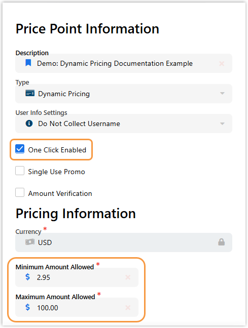 Provide a minimum and maximum price range for the price point; this range will be used to validate the dynamic amounts you send.